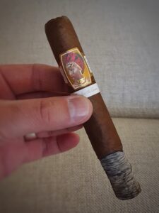 Ab dem zweiten Drittel zeigt sich die Zigarre von ihrer intensiveren Seite: mehr Würze, Muskatnuss blitzt auf, der Körper wird runder, der Geschmack dichter. Ein kleiner Nikotinkick begleitet das Finale – nicht unangenehm, aber deutlich spürbar. Der Abbrand ist bis dahin nahezu bilderbuchmäßig, erst im letzten Drittel muss leicht nachkorrigiert werden. Die Asche? Stabil wie die britische Monarchie und feinschuppig und kompakt wie das Gesicht von King Charles.
