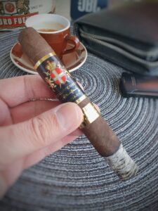 Bereits vor dem Anzünden vermittelt der Kaltzug eine erste Ahnung davon, was den Genießer erwartet. Noten von schwarzem Pfeffer, Holz und feiner Zartbitterschokolade verwöhnen die Geschmackspapillen – ein vielversprechender Auftakt. Nach dem Anzünden entfaltet die Zigarre ein komplexes, aber zugleich harmonisches Aromenspiel. Der erste Zug ist geprägt von warmen Kaffeenoten, die an Espresso erinnern, begleitet von der feinen Würze von Zedernholz und einem Hauch schwarzen Pfeffers.